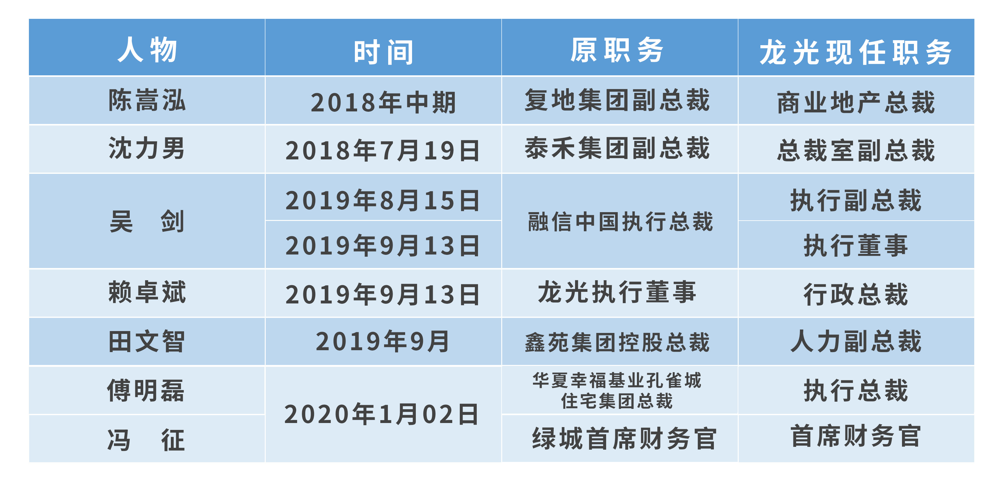 2020年伊始,龍光在一日內確認引入兩名“大將”——1月2日,原華夏幸?;鶚I(yè)孔雀城住宅集團總裁傅明磊確認加盟龍光,任職執(zhí)行總裁;原綠城CFO馮征也于該日正式入職龍光,任首席財務官,此前該崗位由升任集團行政總裁的賴卓斌兼任。