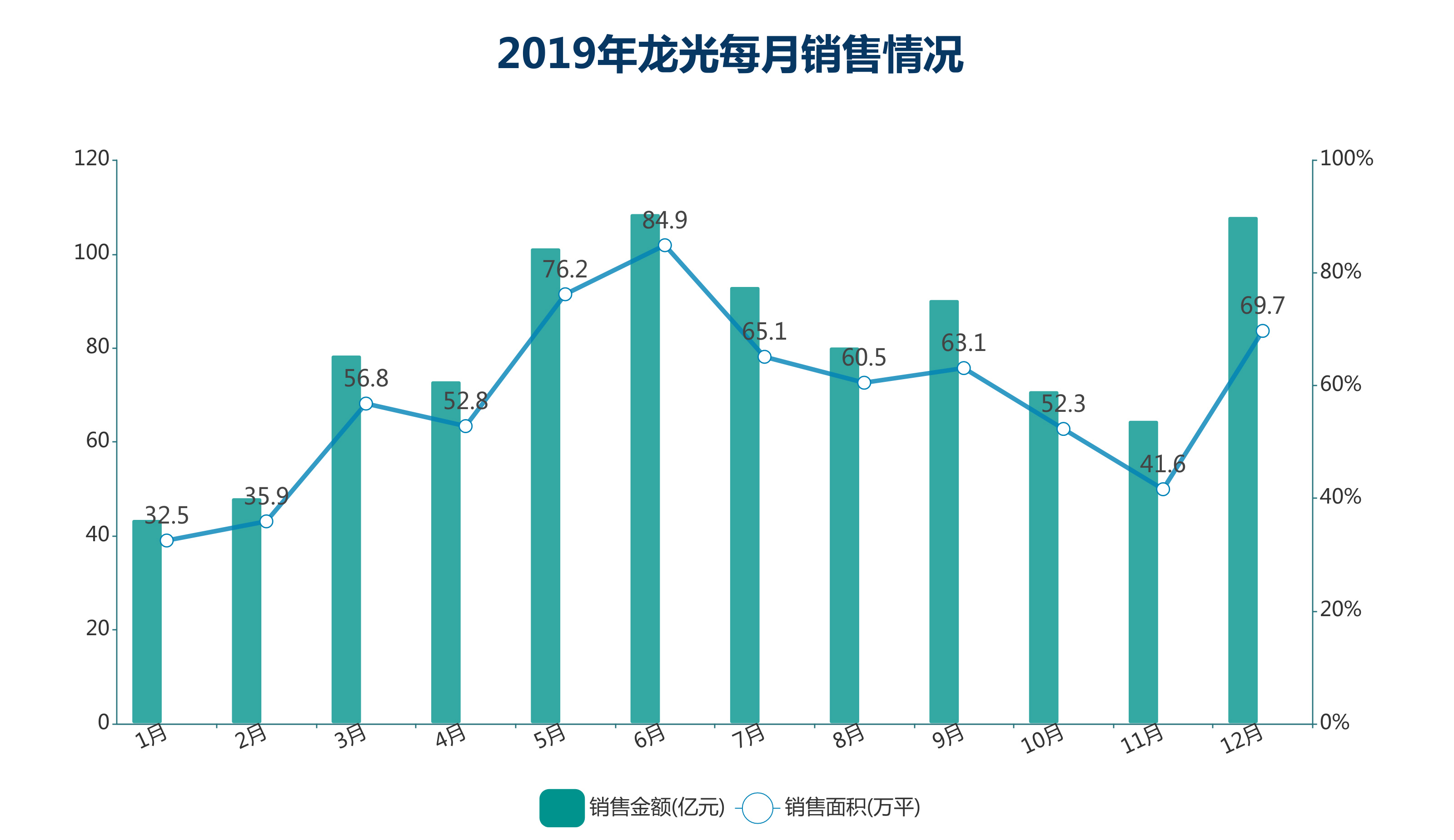 從每月具體數(shù)據(jù)看,龍光銷售較為平穩(wěn),其中6月實現(xiàn)月銷售最高值108.6億元,12月再次沖到108億元,但最終還是未能跨過千億。