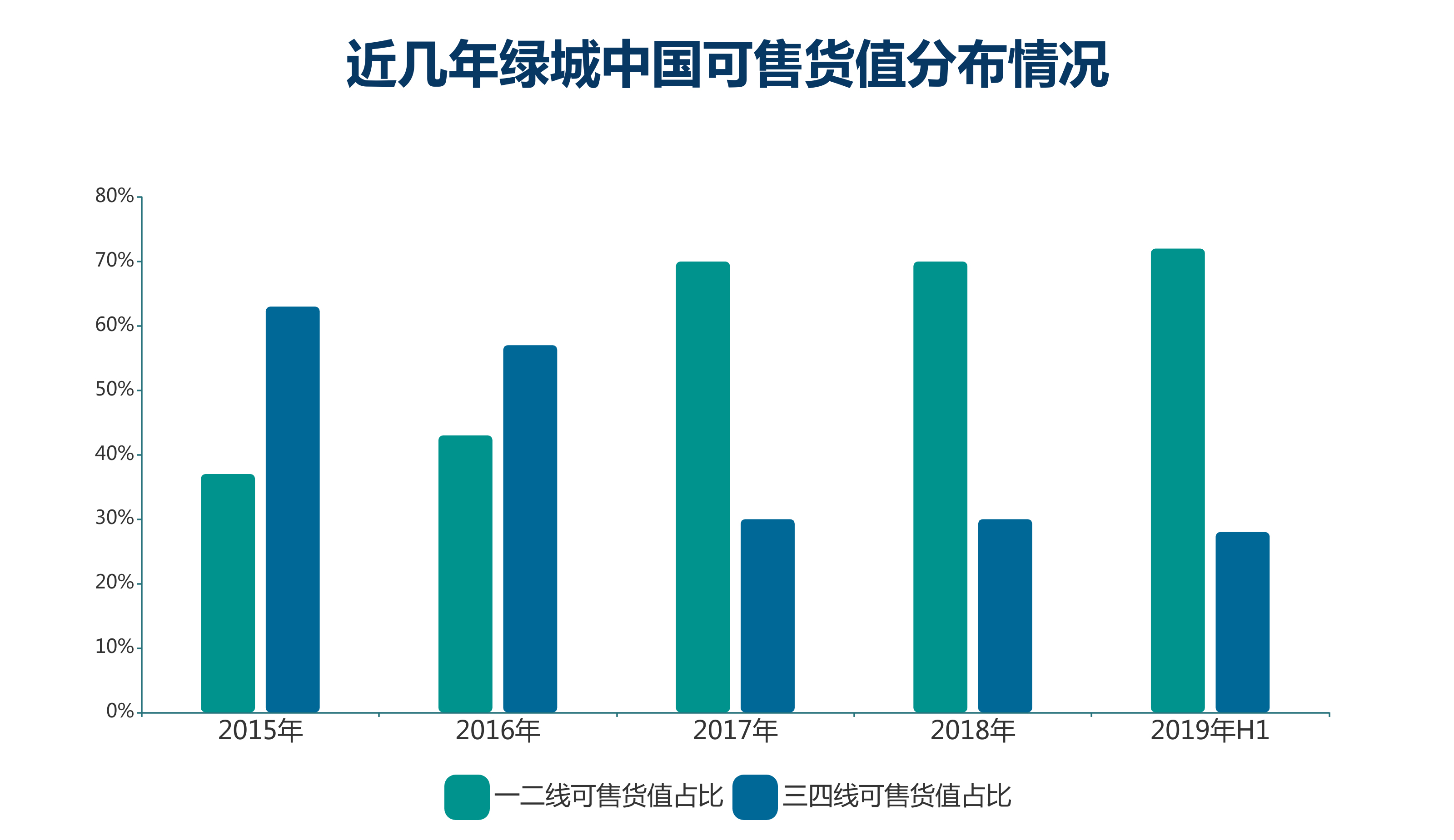 與此同時(shí),在城市布局上,綠城從三四線抽身,重新回到能體現(xiàn)自身產(chǎn)品優(yōu)勢的一二線。截至2019年中期,綠城一二線可售貨值占比從2015年的37%提升至72%。