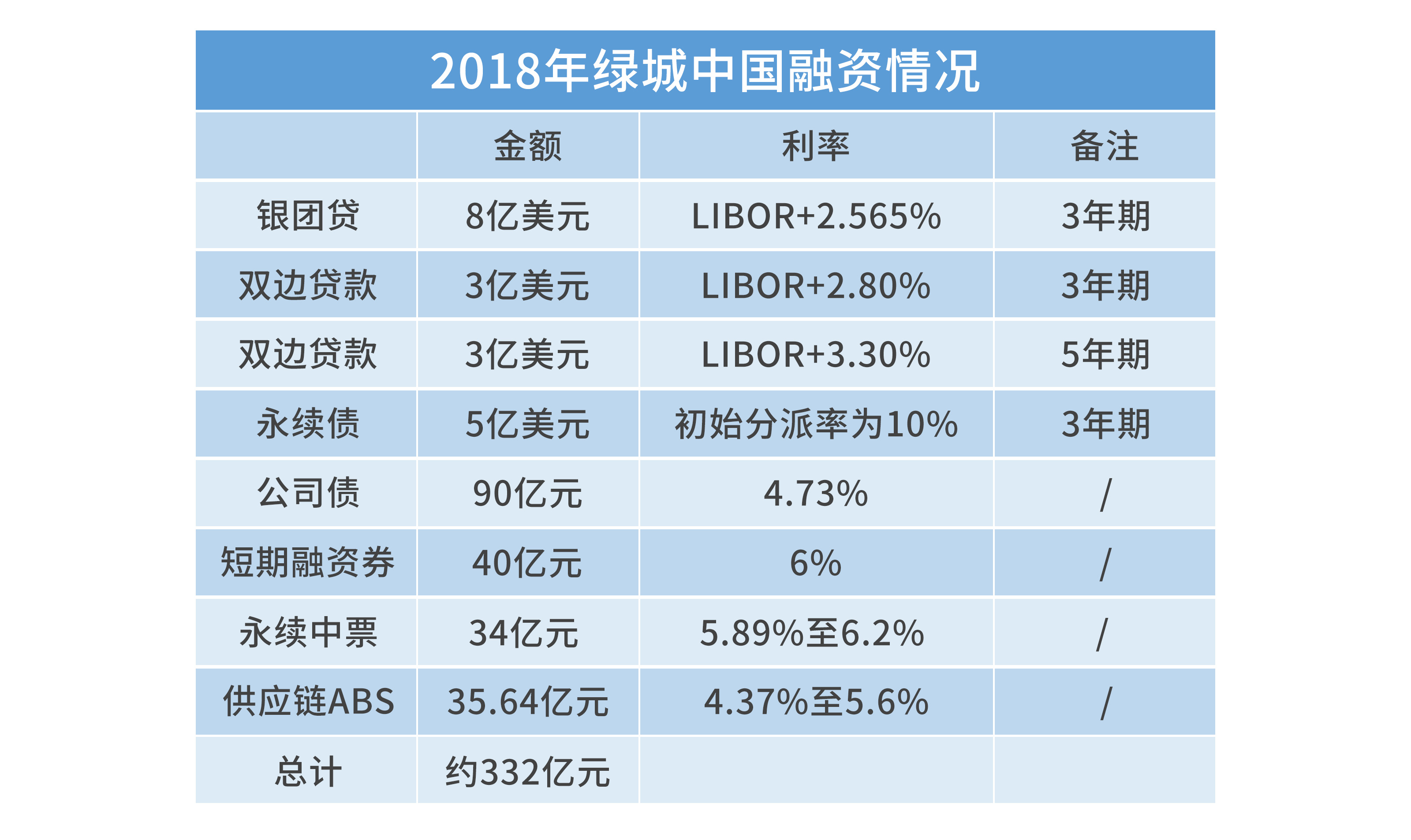 據(jù)觀點(diǎn)新媒體不完全統(tǒng)計(jì),2018年,綠城在境內(nèi)和境外通過發(fā)債、銀團(tuán)貸、供應(yīng)鏈ABS等多種融資工具共計(jì)新增融資332億元,包括一筆總額90億元的公司債,利率4.73%,兩筆合共6億美元的雙邊貸款,一筆5億美元的永續(xù)債,以及一筆8億美元的銀團(tuán)貸。