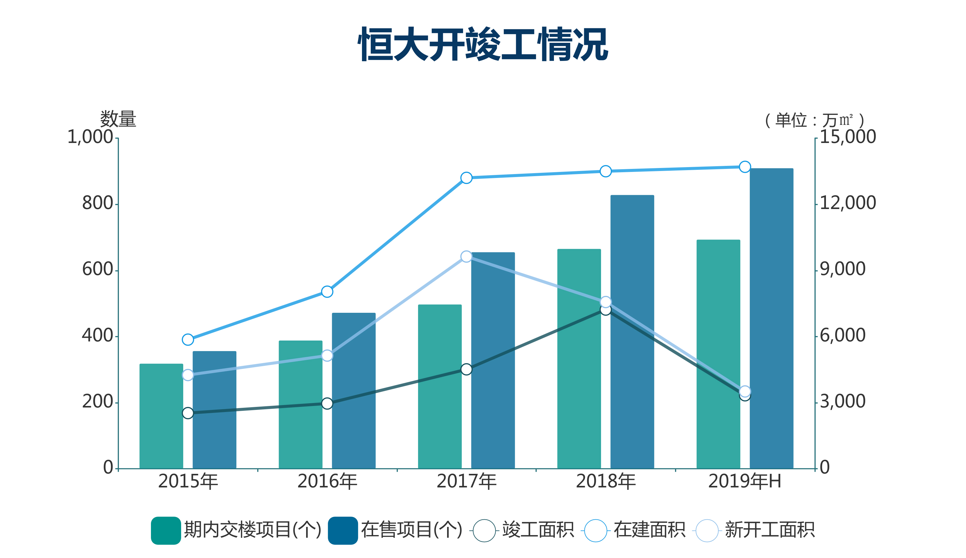 為實現(xiàn)這個目標,恒大的新開工面積、在建面積、竣工面積在2017年開始飆升。其中,新開工面積從2016年5138萬平方米升至2017年9631萬平方米,在建面積一舉沖上1.3億平方米。