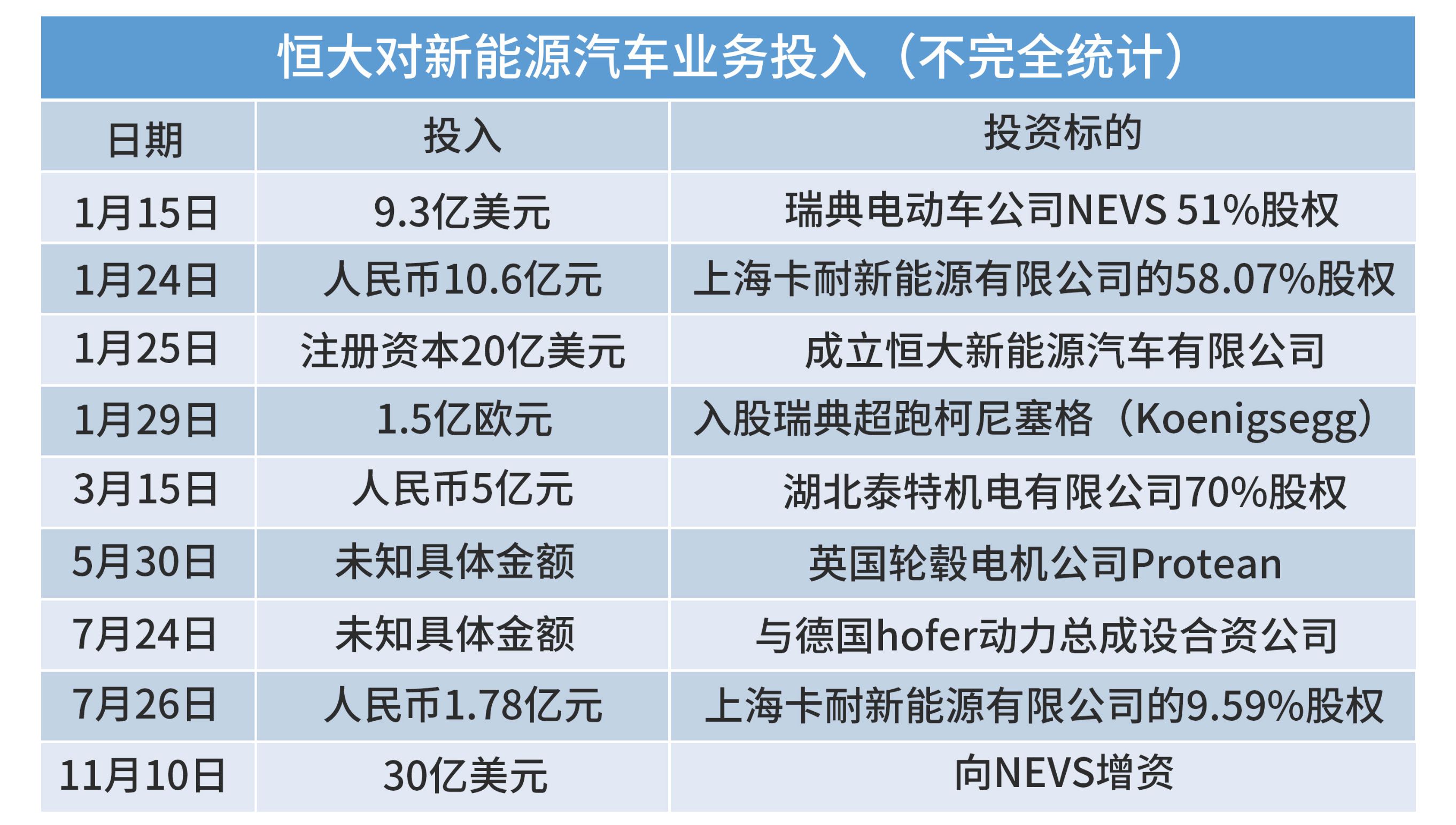 據(jù)恒大披露,包括NEVS、Protean、柯尼塞格的入股等,共花費81.7億元;各大汽車基地土地款的支出約30.6億;產(chǎn)房機械設備等支出9.8億;研發(fā)費用2.6億;并購公司收購前的借款業(yè)務16億元。