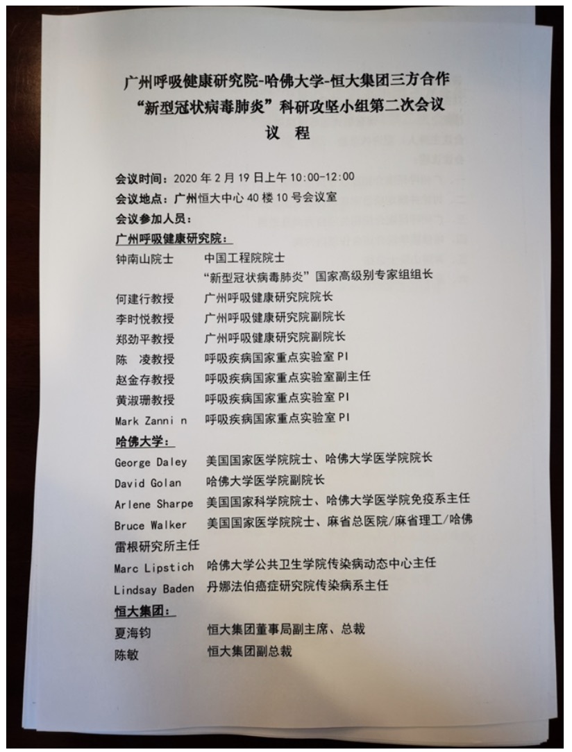 2月18日,鐘南山院士披露,已通過恒大的牽線,與哈佛大學(xué)合作戰(zhàn)“疫”。19日一早,鐘南山團(tuán)隊、恒大團(tuán)隊就在廣州恒大中心與哈佛團(tuán)隊視頻連線,召開聯(lián)合成立新冠病毒肺炎科研攻堅小組以來的第二次工作會議,圍繞新冠肺炎快速檢測診斷、臨床救治、藥物篩選、疫苗研究等四大近期目標(biāo)深入研討近三個小時。