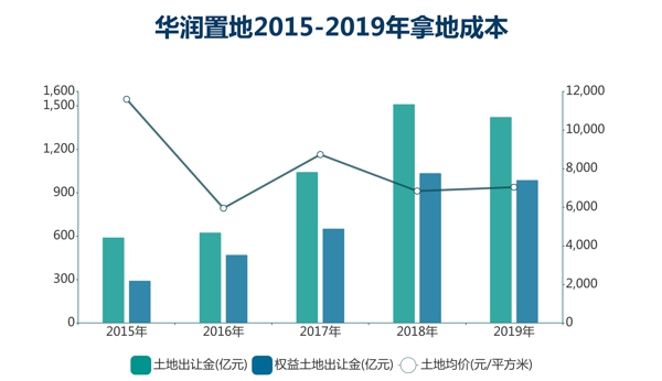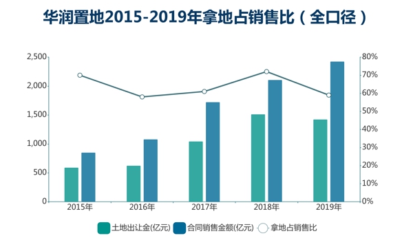 至2019年,華潤置地拿地金額有所下滑,土地權(quán)益價(jià)988.8億元,同比下降4.6%,但拿地占銷售比仍在58%以上,遠(yuǎn)高于土地投資額榜首的萬科(控制在30%-40%)。