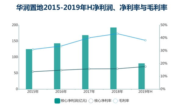 過去多年,華潤置地盈利水平持續(xù)維持行業(yè)高位,2016-2018年以及2019年毛利率分別達(dá)到33.7%、40.3%、43.4%以及38.2%;核心凈利潤為144億元、163.79億元、192.96億元以及81.06億元,均保持雙位數(shù)增長,核心凈利潤率也達(dá)到14.9%、16.1%、15.9%、17.7%。