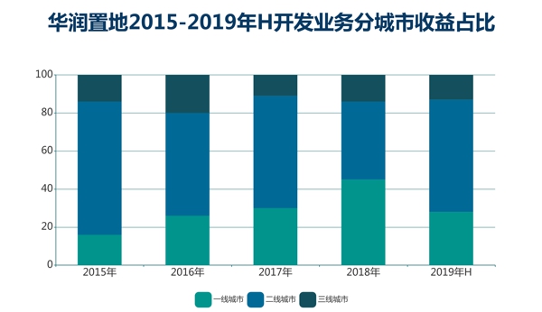 華潤置地開發(fā)業(yè)務(wù)結(jié)轉(zhuǎn)收益占總收益比例大約在9成左右,其中一線城市結(jié)轉(zhuǎn)幾乎是影響毛利率的“晴雨表”:2018年上半年公司在一線城市毛利率高達(dá)60.6%,深圳灣悅府、深圳華潤城三期項(xiàng)目毛利率均超過70%;而2019年上半年,公司在一線城市毛利率降至51.5%,深圳結(jié)轉(zhuǎn)占比也降一半至14%。