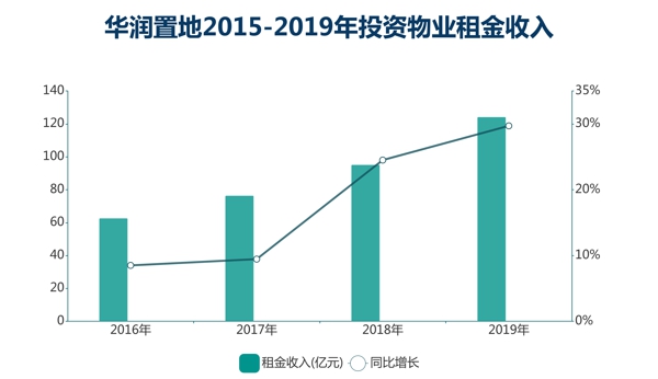 若按此計(jì)算,2019年該公司開發(fā)業(yè)務(wù)毛利率將是近三年最低水平。相比之下,投資物業(yè)作為華潤置地第二增長極,表現(xiàn)出穩(wěn)定發(fā)展勢頭。