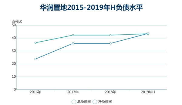 2019年上半年,華潤置地總有息負(fù)債率43.4%,過去三年分別是36.4%、42.3%、42.3%;凈有息負(fù)債率43.6%,過去三年分別為23.8%、35.9%、47.2%;平均融資成本為4.45%,過去三年分別為4.23%、4.16%、4.47%,是國內(nèi)融資成本最低的房企之一。
