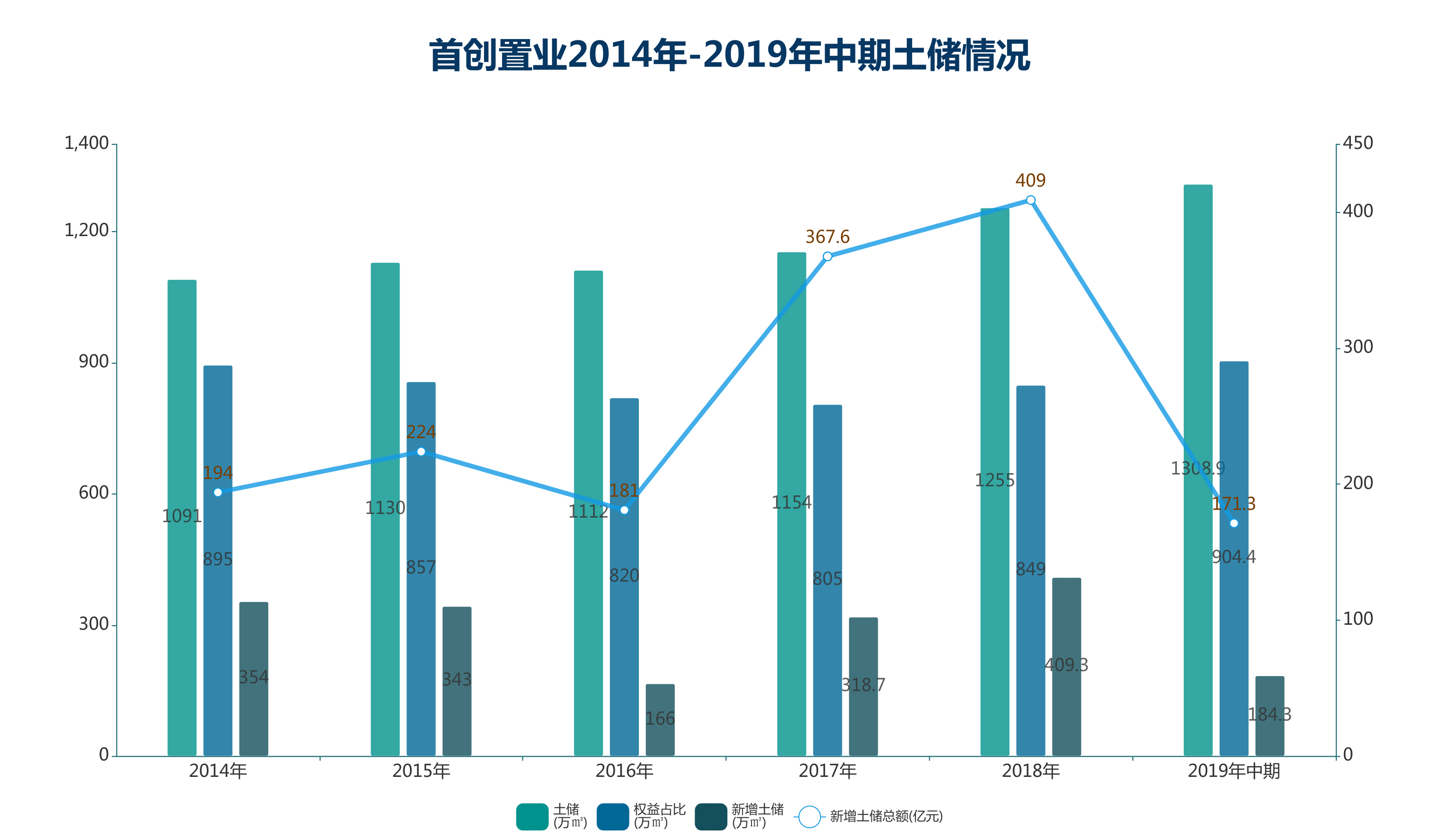 數據顯示,2019年中期,首創(chuàng)置業(yè)土儲面積達到歷史最高點,為1308.9萬平方米,權益面積為904.4萬平方米。其中,2018年度斥資409億元擴儲409.3萬平方米,2019年前6個月斥資171.3億元擴儲184.3萬平方米,期間首進城市包括廣州、佛山、蘇州、東莞和廈門等。
