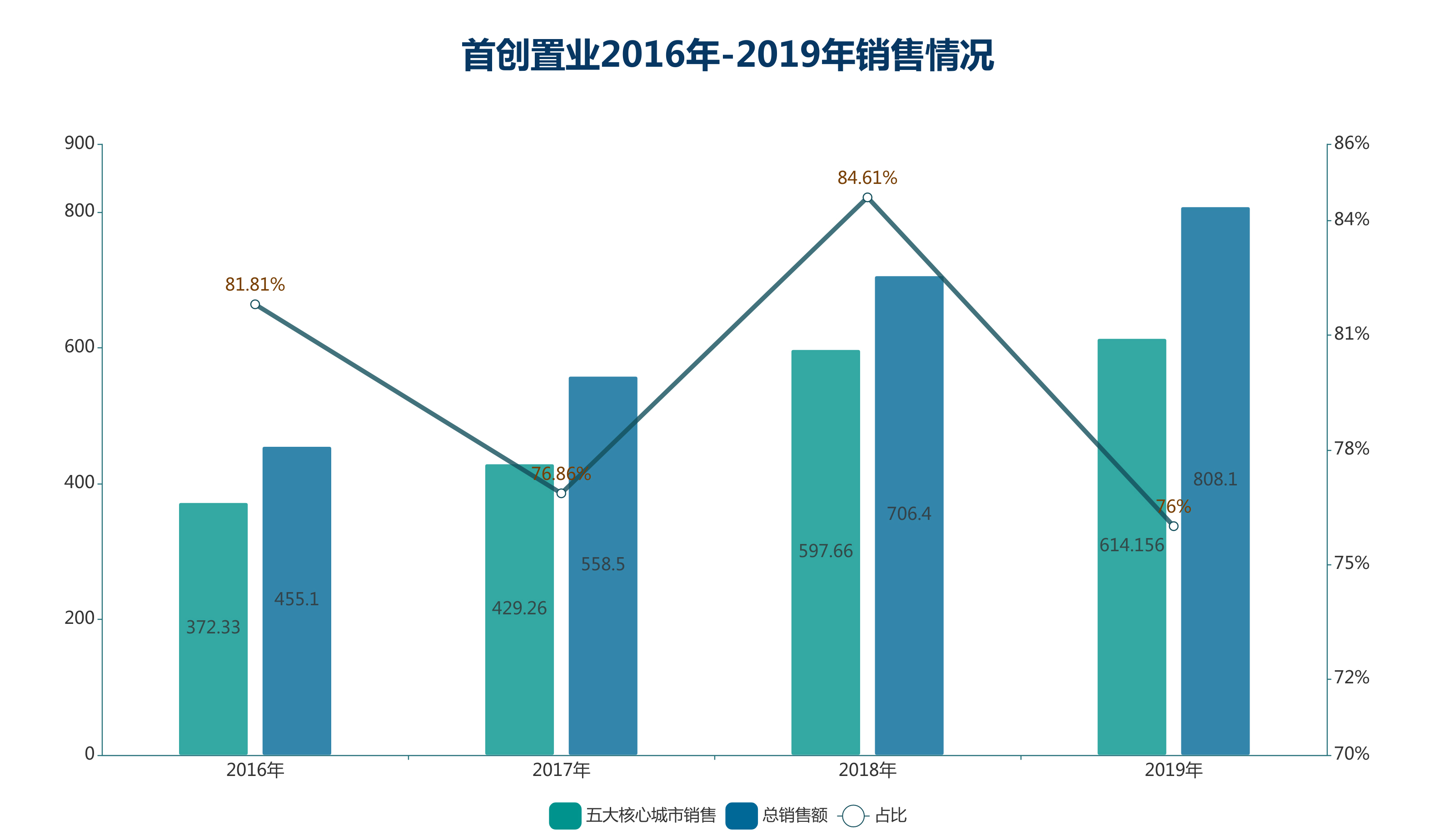 反觀銷售層面,雖然布局戰(zhàn)略上轉變?yōu)?ldquo;三大城市群”,但新進入城市銷售貢獻尚未得到體現,五大核心城市仍然是首創(chuàng)置業(yè)業(yè)績主要來源。2017年至2019年,五大核心城市占總銷售金額比例分別為76.86%、84.61%、76%,三年均在此區(qū)間起伏。