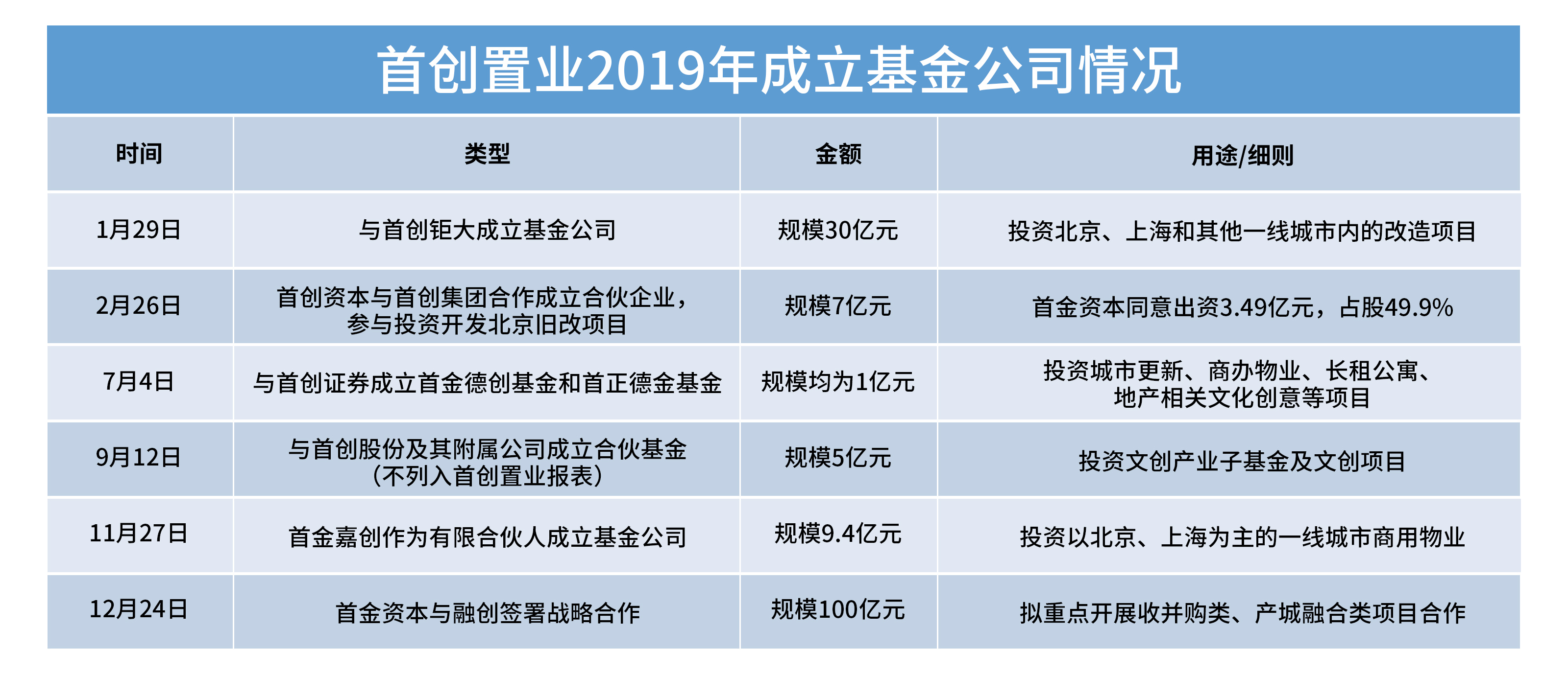 2019年,隨著首金資本的推進,企業(yè)資金猶如打開了水龍頭一般。其中,首創(chuàng)置業(yè)前后聯合“首創(chuàng)系”成立6家基金公司,投資方向包括改造項目、城市更新、商辦物業(yè)、長租公寓、文創(chuàng)業(yè)務等,合計規(guī)模達53.4億元。