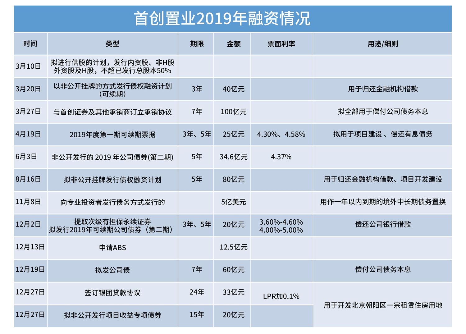 對比發(fā)現,2019年全年,首創(chuàng)置業(yè)的融資動作均用于償還現有債務,以及個別用于項目開發(fā)建設,其中不計負債、計權益的永續(xù)債是其最為主要的選擇。