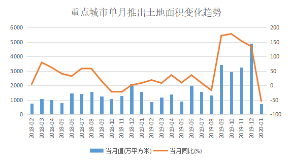 首先受到波及的便是土地推出供應(yīng)方面。以觀點(diǎn)指數(shù)監(jiān)測(cè)的23個(gè)重點(diǎn)一二城市情況來(lái)看,2020年1月單月推出土地147宗,總面積709.95萬(wàn)平方米,同比減少54.56%,環(huán)比減少62.47%。