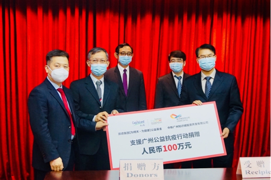 捐贈(zèng)儀式當(dāng)天,在新加坡駐廣州領(lǐng)事館總領(lǐng)事羅德杰、廣州市委常委、市政府副市長(zhǎng)胡洪的見證下,凱德集團(tuán)(中國(guó))專項(xiàng)項(xiàng)目首席執(zhí)行官、知識(shí)城合資公司董事陳培進(jìn)及知識(shí)城合資公司總裁陳長(zhǎng)新作為捐贈(zèng)方代表,向廣州市公益抗疫行動(dòng)捐贈(zèng)100萬(wàn)元,由廣州市民政局副局長(zhǎng)、廣州市慈善會(huì)常務(wù)副會(huì)長(zhǎng)韋錦堅(jiān)接收。