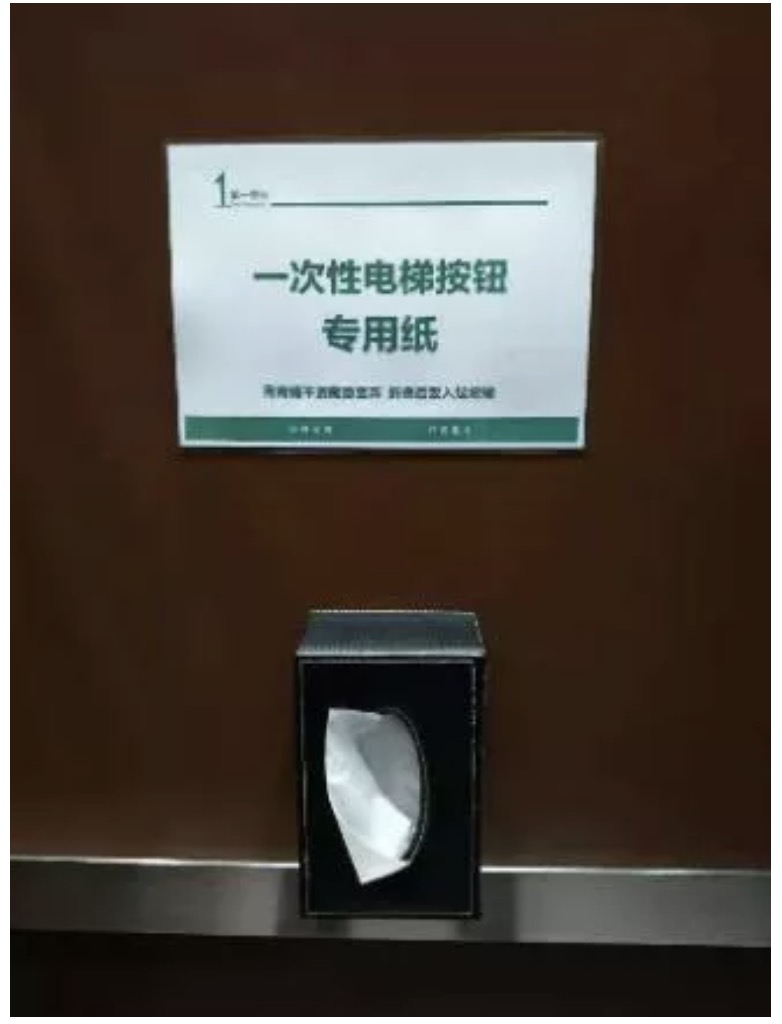 而業(yè)主在進入電梯也會發(fā)現(xiàn),第一物業(yè)已經(jīng)暖心的在每部電梯里放置了一次性紙巾,用于不直接觸碰按鈕,通過紙巾的隔離,有效的避免了交叉感染的可能性。