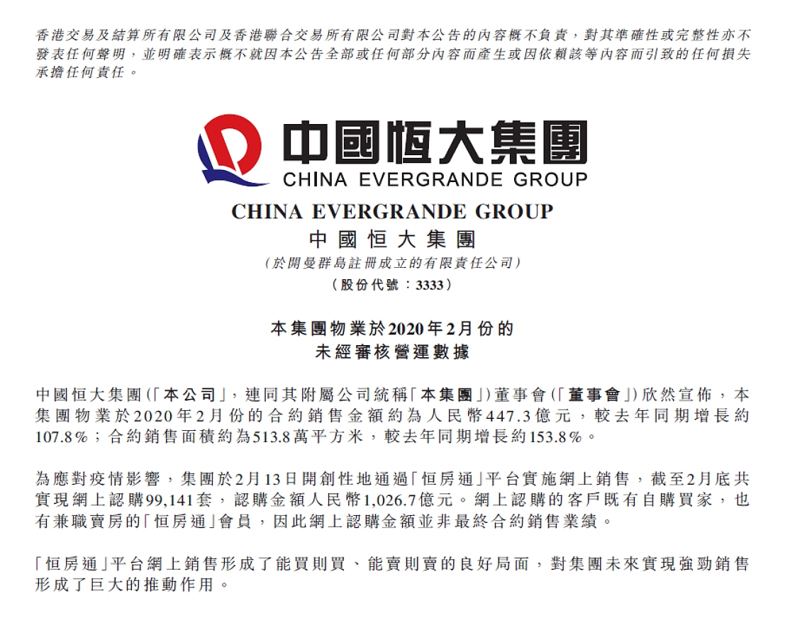 3月5日,中國恒大(3333.HK)發(fā)布公告,2月實現(xiàn)合約銷售447.3億,同比大增108%,銷售面積513.8萬平方米,同比大增154%,均位居行業(yè)首位。截至2月末,恒大累計銷售853億,同樣排在行業(yè)第一。