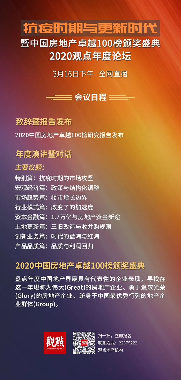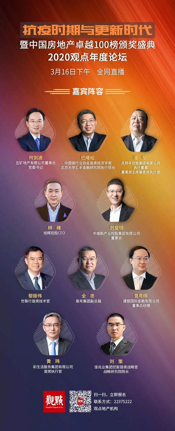 3 月16日下午各領域知名大佬巴曙松、何劍波、潘軍、林峰、劉愛明、黎振偉、全忠、曾粵暉、黃瑋、劉策等將進行極具專業(yè)的年度演講、年度對話,他們將深刻剖析焦灼的行業(yè)現(xiàn)狀、預測中短期房地產(chǎn)行業(yè)形勢、如何穩(wěn)住與提升銷售業(yè)績,如何融資使得現(xiàn)金流充足、如何做更好的產(chǎn)品來應對后疫情時代的消費需求,如何讓更好的物業(yè)提升產(chǎn)品的價值!
