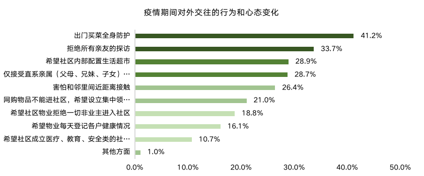 疫情讓人們對外交往行為銳減,出門全身防護(hù),拒絕探訪等成為主流選擇。對物業(yè)服務(wù)要求更高,社區(qū)生活觀念更為強(qiáng)烈,對于社區(qū)內(nèi)實(shí)現(xiàn)生活超市購物、無接觸收發(fā)快遞、醫(yī)療教育等需求尤為凸顯,指導(dǎo)我們對于社區(qū)升級的方向。多數(shù)家庭仍能保持規(guī)律的作息習(xí)慣,但是也有29.7%的家庭生活規(guī)律被打亂。