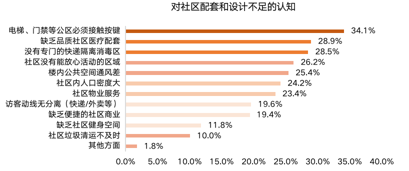 本次調(diào)研我們認(rèn)識到人居健康六大方面不足:居住產(chǎn)品設(shè)計(jì)不科學(xué);人居科技系統(tǒng)不完善;社區(qū)生態(tài)空間不充足;社區(qū)配套服務(wù)不健全;智能社區(qū)普及不深入;物業(yè)服務(wù)品質(zhì)不達(dá)標(biāo)。