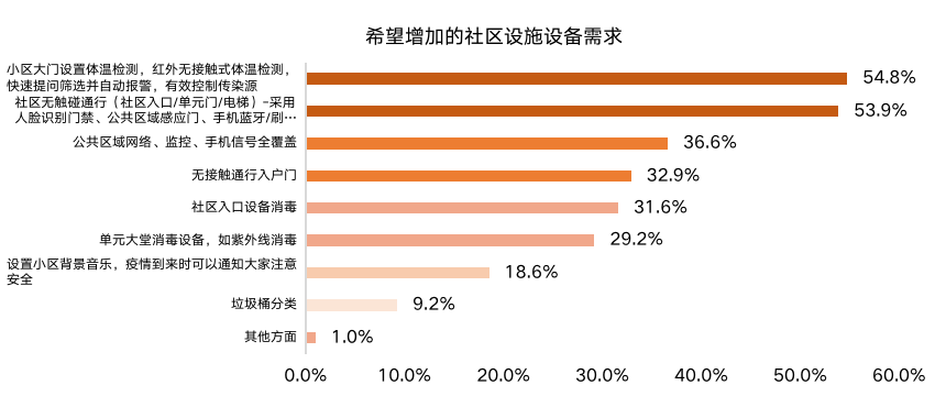 在社區(qū)設(shè)備層面,無接觸、高防控管理是規(guī)避感染的有效舉措,目前社區(qū)在公區(qū)無觸碰、物業(yè)防疫管理等方面并不盡如人意。“無觸碰科技社區(qū)”與“物業(yè)服務(wù)水平”,是必將提升的產(chǎn)品與服務(wù)要點(diǎn)。