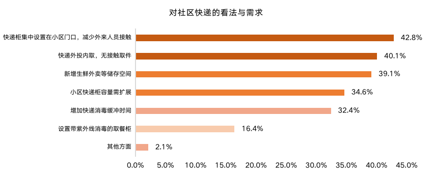快遞收發(fā)已成為人們生活最高頻的對外接觸方式,疫情期間如何做好防控,保護(hù)在收發(fā)過程中的安全無毒成為客戶高度關(guān)注的要點(diǎn),外投內(nèi)取、消毒緩沖、獨(dú)立的隔離儲存空間是未來社區(qū)的提升重點(diǎn)。