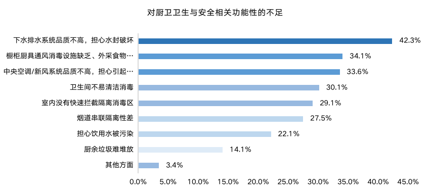 廚衛(wèi)是與家庭健康關(guān)聯(lián)度最高的區(qū)域,空間內(nèi)與衛(wèi)生相關(guān)的設(shè)備設(shè)施尤為重要。下水排水系統(tǒng)不安全,擔(dān)心引起串聯(lián)污染;櫥柜廚具通風(fēng)消毒設(shè)備缺乏;衛(wèi)生間設(shè)施清潔消毒性差;已經(jīng)成為高關(guān)注敏感點(diǎn),并不會隨著疫情而逝去,將是長期的持續(xù)需求,衛(wèi)生層面仍要持續(xù)的關(guān)注提升。