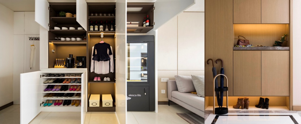 玄關(guān)過度空間是室內(nèi)安全的第一道防線,重要性被突出,雙動線、玄關(guān)收納隔離區(qū),雙重衛(wèi)生與消殺設(shè)備收納,結(jié)合玄關(guān)空間,打造玄關(guān)隔離收納區(qū)域,實(shí)現(xiàn)入戶過渡、外帶物品暫存、消殺器具收納等功能。