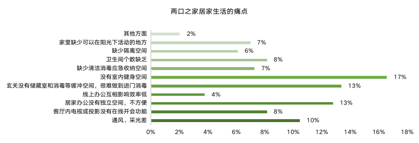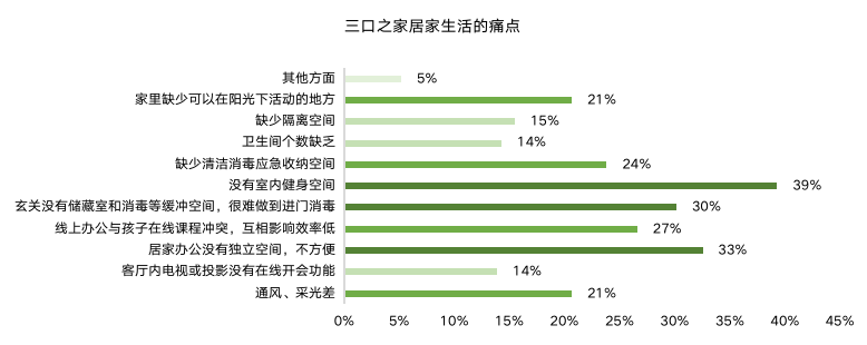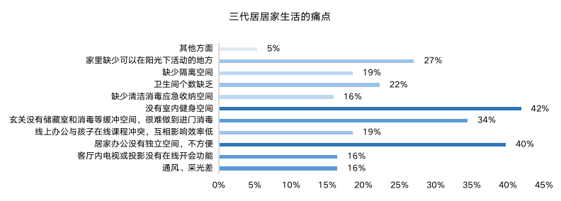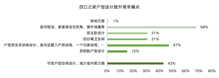 痛點(diǎn)傳導(dǎo)需求,“家庭安全消殺”、“室內(nèi)健身空間”是較突出的兩大痛點(diǎn)體驗(yàn)。加之對家人與健康的關(guān)注提高,多元功能獨(dú)立空間、玄關(guān)動線優(yōu)化、四分離衛(wèi)生間、全屋恒潔等需求成趨勢。