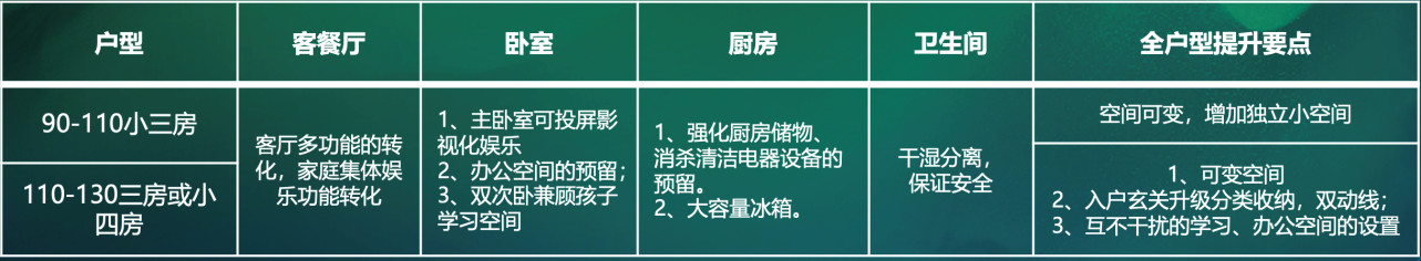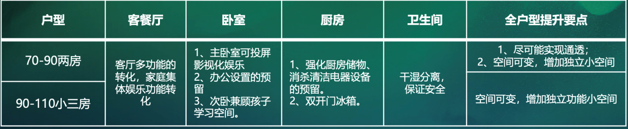 兩代居三口之家:有更強(qiáng)烈的換房或功能升級的需求;提升要點(diǎn):客廳多功能轉(zhuǎn)化、可變多功能空間。