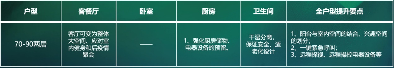 養(yǎng)老:核心痛點(diǎn)為無人陪伴的孤獨(dú),和室內(nèi)健身空間;提升要點(diǎn):遠(yuǎn)程探視一鍵操控,適老化設(shè)計(jì)。