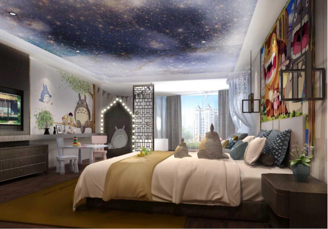 小鎮(zhèn)核心區(qū)的阿爾卡迪亞濱海度假酒店,主打豪華舒適定位,859套豪華舒適的五星級客房中,許多房間都是專門為兒童設(shè)計的親子主題客房。疫情當(dāng)前的特殊時期,為了給飽受疫情原因禁足家中的孩子以更多的驚喜,酒店通過一系列談判,成功獲得了熊本熊、龍貓等一批熱門卡通形象的正版授權(quán)。一個調(diào)皮呆萌的熊本熊,連許多大人都招架不住,而宮崎駿爺爺筆下那個陪著我們走過童年時光的龍貓,也會像一個老朋友,將溫暖與美好,繼續(xù)傳遞給我們的孩子。