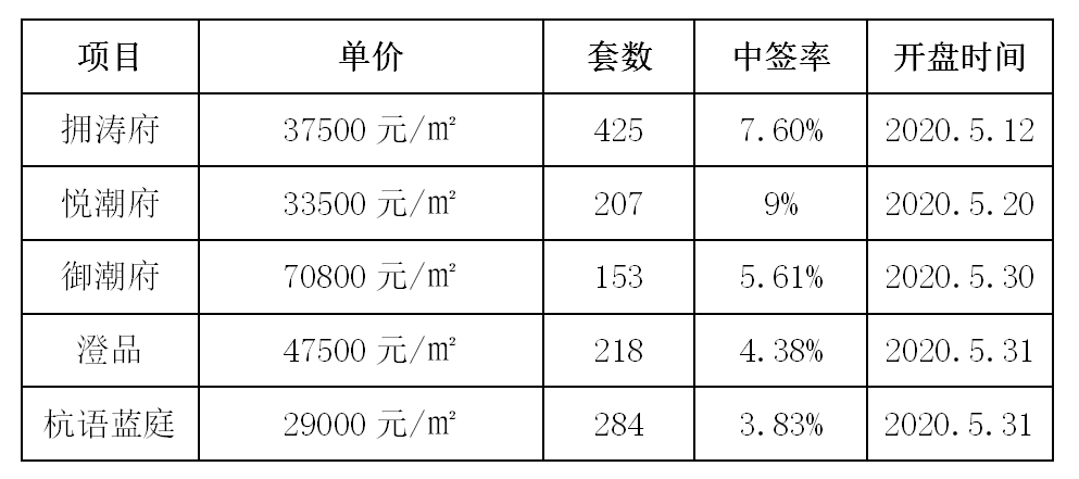 2020年前五月濱江實現(xiàn)銷售額403.2億元,在杭州樓市搖號的情況下,濱江的項目中簽率更低,屢屢開盤即售罄。進入5月以來銷售形勢更是持續(xù)向好,所有濱江在杭項目的平均中簽率均不到10%,就連御潮府這樣千萬級的豪宅中簽率也僅為5.62%。