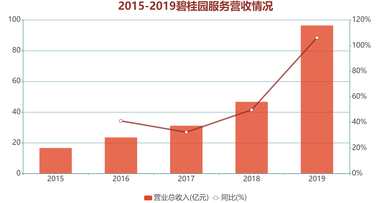 碧桂園服務(wù)的千億市值,與其發(fā)展速度不無關(guān)系。據(jù)財報顯示,2019年碧桂園服務(wù)營業(yè)收入96.45億元,同比增速達(dá)到106%,復(fù)合增長率近55%。