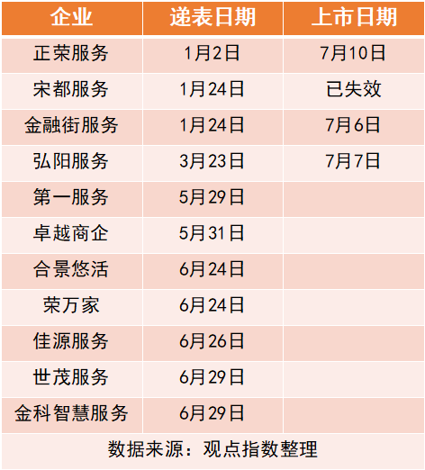截止6月30日,累計(jì)已有11家物業(yè)公司在港交所提交招股書。值得注意的是,7月有3家物企集中上市,按時間先后分別是金融街物業(yè)、弘陽服務(wù)、正榮服務(wù)。換而言之,目前港股市場上等待聆訊的物業(yè)企業(yè)還有7家。