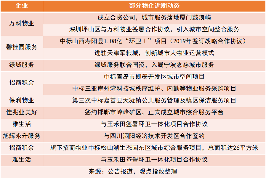 另一方面,隨著物業(yè)管理行業(yè)市場化逐步推進(jìn),原有的市政、后勤系統(tǒng)逐步打破,越來越多企業(yè)開始往城市服務(wù)領(lǐng)域進(jìn)行拓展嘗試,并有逐漸成為新“藍(lán)海”的趨勢。