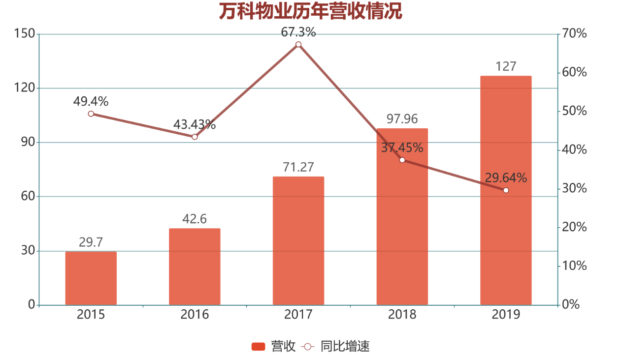 據(jù)年報數(shù)據(jù)披露,萬科物業(yè)在2019年?duì)I收達(dá)到127億元,而此前的2016年,其營收僅42.6億元,歷時3年就成為了內(nèi)地首個邁入百億營收的物管企業(yè),年復(fù)合增長超40%。