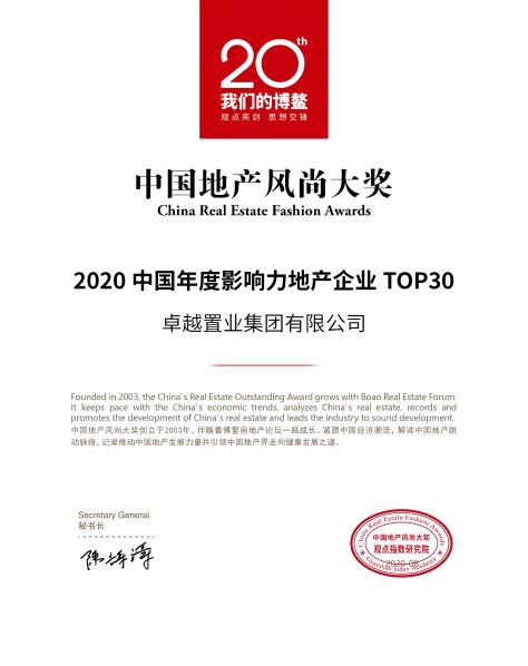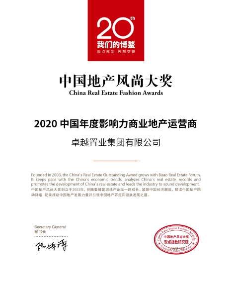 傲人的成績(jī)值得行業(yè)效仿,卓越置業(yè)集團(tuán)有限公司憑借在過(guò)去一年的努力,榮登2020年度中國(guó)地產(chǎn)風(fēng)尚大獎(jiǎng)“2020中國(guó)年度影響力地產(chǎn)企業(yè)TOP30”及“2020中國(guó)年度影響力商業(yè)地產(chǎn)運(yùn)營(yíng)商”。