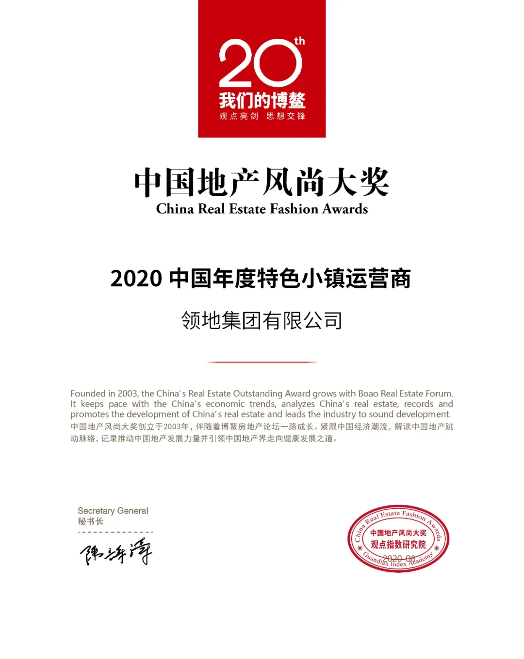 8月12日, 2020博鰲房地產(chǎn)論壇現(xiàn)隆重發(fā)布“2020年度中國地產(chǎn)風(fēng)尚大獎”。傲人的成績值得行業(yè)效仿,領(lǐng)地集團(tuán)有限公司憑借在過去一年的努力,榮登2020年度中國地產(chǎn)風(fēng)尚大獎“2020中國年度特色小鎮(zhèn)運(yùn)營商”。