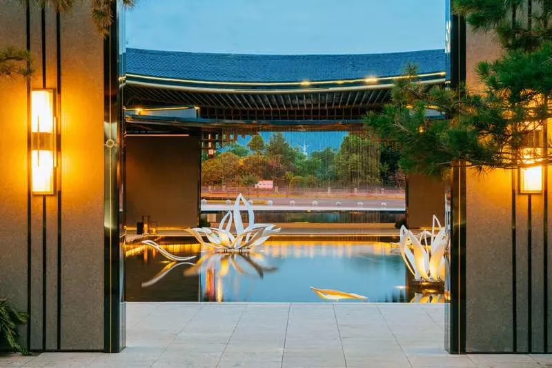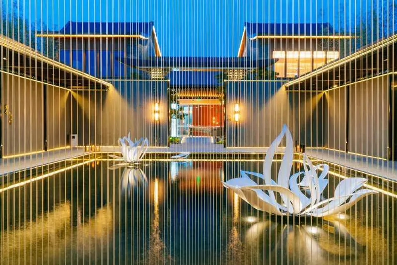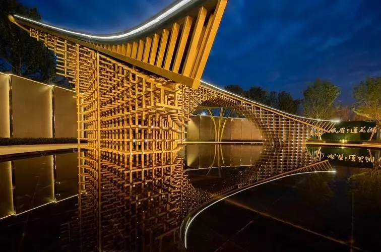 項(xiàng)目建設(shè)有酒店集群、湖泊水舞光影秀、商業(yè)街區(qū)、全功能度假公寓。景觀方面以“月影峨眉”立意,以期成為峨眉月、象湖景之紐帶。以多進(jìn)院落空間,串聯(lián)起層層遞進(jìn)的移步異景效果,形成人、建筑、景觀的多維互動。以極富張力的弧形元素,讓重要的空間節(jié)點(diǎn)與周邊文脈氣質(zhì)相協(xié)調(diào)。