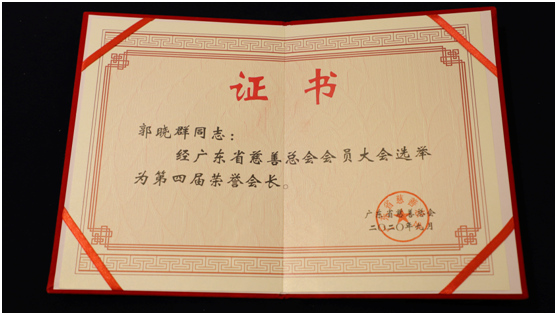 9月5日, “廣東省慈善總會(huì)2020年會(huì)員大會(huì)”在廣州圓滿(mǎn)召開(kāi),理事會(huì)換屆等各項(xiàng)工作也順利完成。此次大會(huì)上,佳兆業(yè)集團(tuán)執(zhí)行董事郭曉群獲聘擔(dān)任新一屆榮譽(yù)會(huì)長(zhǎng)一職。榮譽(yù)會(huì)長(zhǎng)是廣東省慈善總會(huì)授予為廣東省慈善事業(yè)作出重大貢獻(xiàn)人士的崇高榮譽(yù),此舉不僅是對(duì)郭曉群多年來(lái)熱衷公益慈善的高度認(rèn)可,也是對(duì)佳兆業(yè)集團(tuán)積極投身社會(huì)慈善事業(yè)的極大肯定。