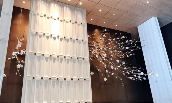 在酒店大堂空中“綻放”的梅花樹,材料從一開始的鐵藝,到后來的樹脂,都因為自然度不夠被推翻。最后選擇了一個呈現(xiàn)效果最好,但做起來最難的方式,即用原木作材料,用小樹枝一點一點地拼湊。6個人每天坐在地上仔細研判、反復嘗試每一個樹枝最合適的擺放位置,這樣一坐就是10個小時,經(jīng)過5天的努力,才拼就出一枝韻味濃郁、生機十足的“梅花樹”。這株“梅花樹”也成為了不少賓客的拍照打卡之景。