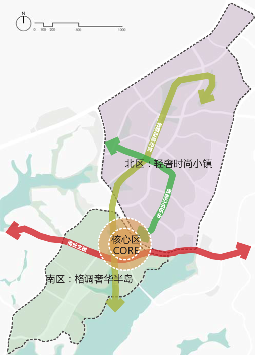 整個項目體量超1000萬方,足足3個珠江新城的規(guī)模,以“一心、三軸、南北區(qū)”規(guī)劃框架,東西商業(yè)主軸、南北溪谷景觀綠軸和中心步行綠軸貫穿整個項目,萬畝湖山間,三大濱水岸線主題、地標(biāo)性文體中心、熱鬧繁華的商業(yè)均勻分布,力求打造北部輕奢時尚小鎮(zhèn)與南部格調(diào)奢華半島。
