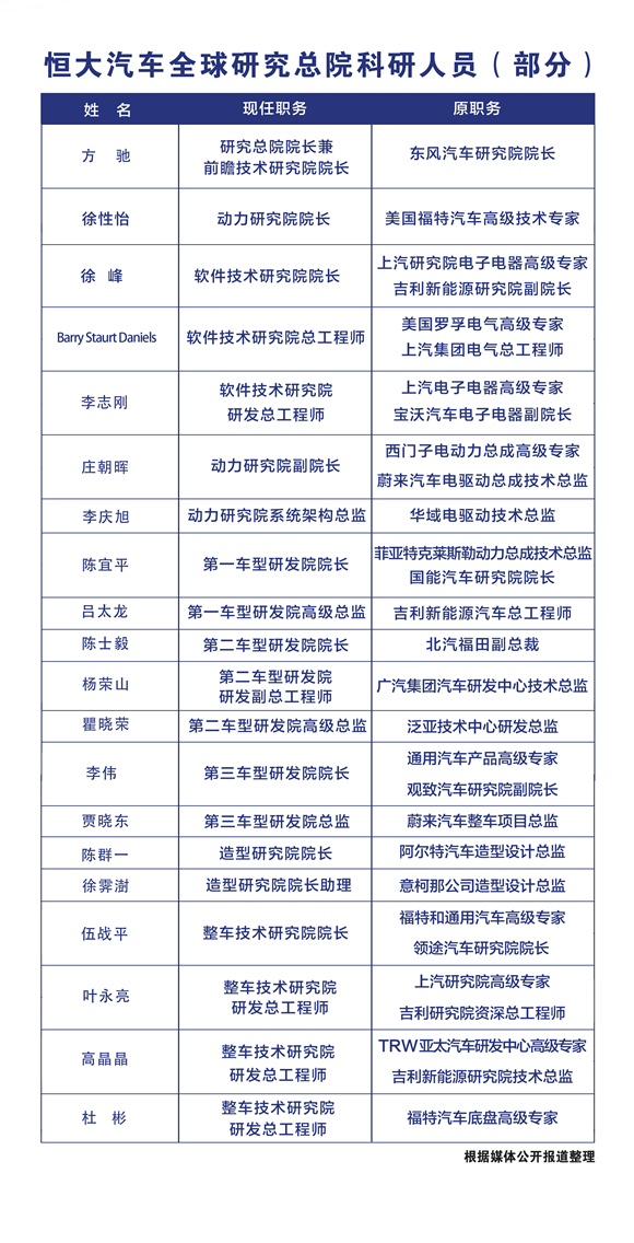 近日,隨著許家印視察恒大全球電池研究總院和恒大汽車全球研究總院的行程曝光,恒大的技術(shù)研發(fā)團(tuán)隊(duì)實(shí)力才第一次向外界展露:不僅在電池研發(fā)這一核心技術(shù)上擁有李浚秀、小澤和典、芳尾真幸等國際知名電池科學(xué)家,在其他領(lǐng)域恒大同樣招攬了頂尖的專業(yè)人才,如動(dòng)力研究院院長(zhǎng)徐性怡、整車技術(shù)研究院院長(zhǎng)伍戰(zhàn)平等,都是老牌車企的技術(shù)專家。11大專業(yè)研究院,合計(jì)擁有3200多名科研人員,這個(gè)規(guī)模還將可望繼續(xù)擴(kuò)大。