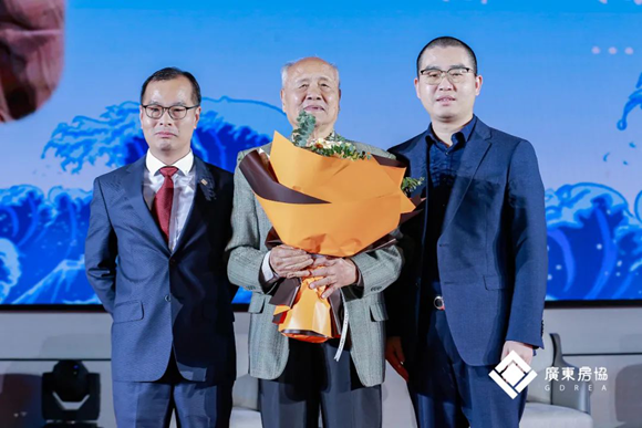 △廣東省房協(xié)會長王韶(左)及“后浪”代表:佳兆業(yè)集團副總裁、首席經(jīng)濟學家劉策(右)向駱錦星前輩(中)敬獻鮮花