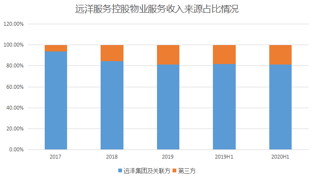 數(shù)據(jù)顯示,遠洋服務發(fā)展依然緊靠遠洋集團,2017年-2019年以及2020年上半年物業(yè)管理收入中,來自遠洋集團及關聯(lián)方的占比高達94%、84.5%、81.5%以及81.2%。