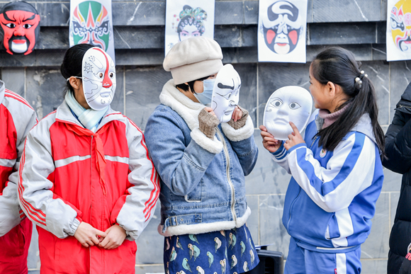 課堂設(shè)立在已有超過一千年歷史的豐陽古村的中央戲臺上,孩子們在三位“田埂花開”藝術(shù)素質(zhì)支教老師的帶領(lǐng)下,通過講解和體驗(yàn)重新認(rèn)識他們熟悉又陌生的本土文化,創(chuàng)作出一個(gè)個(gè)形象豐富的祈劇臉譜,并逐一與大家分享自己的靈感來源。