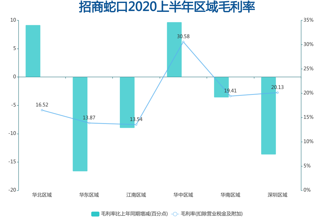實(shí)際數(shù)據(jù)上,招商蛇口華東、江南兩地,貢獻(xiàn)了排名前列的銷售規(guī)模和營收,但是毛利率卻是最低,在2020年中期,毛利率(扣除營業(yè)稅金及附加)分別為13.87%、13.54%,與上年同期相比減少16.66個(gè)百分點(diǎn)及9.01個(gè)百分點(diǎn)。