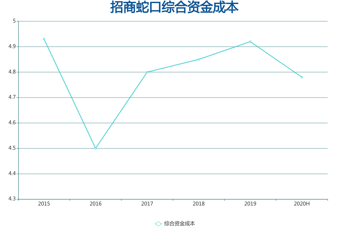 數(shù)據(jù)顯示,從2015年至2019年,招商蛇口綜合資金成本為4.93%、4.5%、4.8%、4.85%、4.92%;2020年上半年,綜合資金成本為4.78%,銷售排行榜前50企業(yè)的加權(quán)融資成本則平均在6%至6.5%之間。