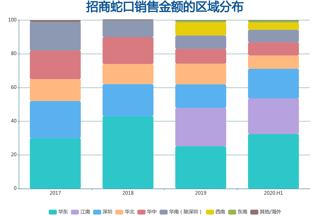 (注:2018年招商蛇口進(jìn)行了區(qū)域架構(gòu)調(diào)整,從華北、華東、華中、華南、深圳五大區(qū)域變?yōu)榫糯髤^(qū)域,江南區(qū)域?yàn)樵A東區(qū)域分拆而成)
