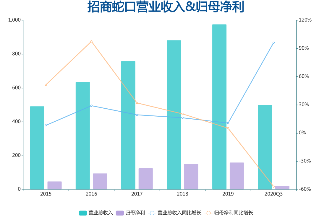 數(shù)據(jù)顯示,招商蛇口在2015年至2019年實(shí)現(xiàn)營收492.22億元、635.74億元、759.38億元、882.78億元、976.72億元,同比分別增長8.21%、29.16%、19.45%、16.25%、10.64%。